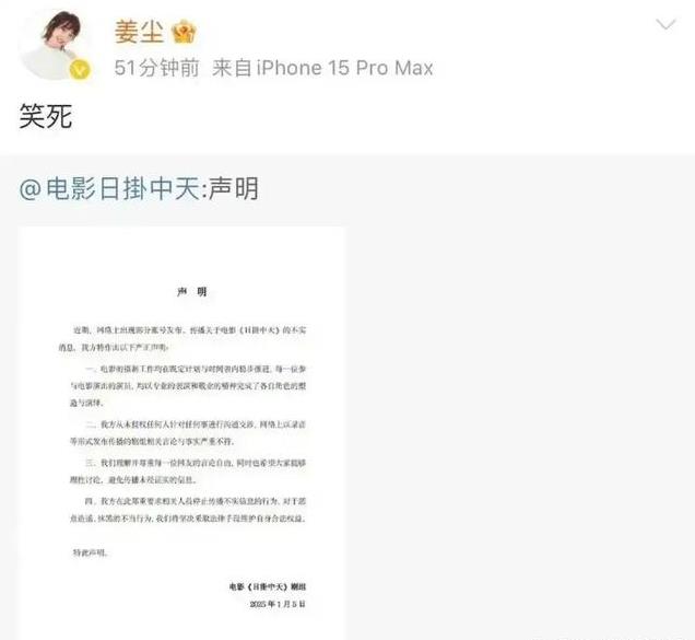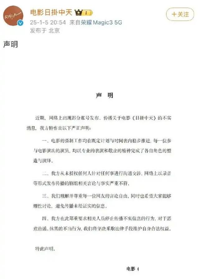 而后,《日挂中天》的剧组也对此进行了辟谣,称录音内容与事实不符,并表示将采取法律手段维护自身权益。面对剧组的辟谣,姜尘并没有选择沉默,而是继续在网络上发布相关信息,并质疑剧组的声明,表示自己所发布的内容都是事实。