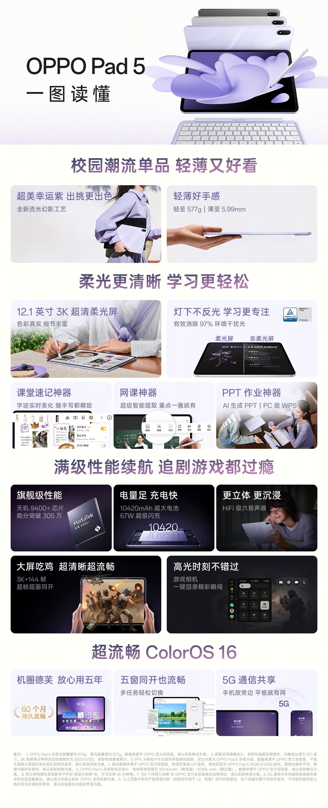 优雅设计:幸运紫配色,轻薄机身全新幸运紫配色采用流光幻影工艺,颜值出众。整机重量仅577g,厚度5.99mm,在保证大屏体验的同时,兼顾了便携性。