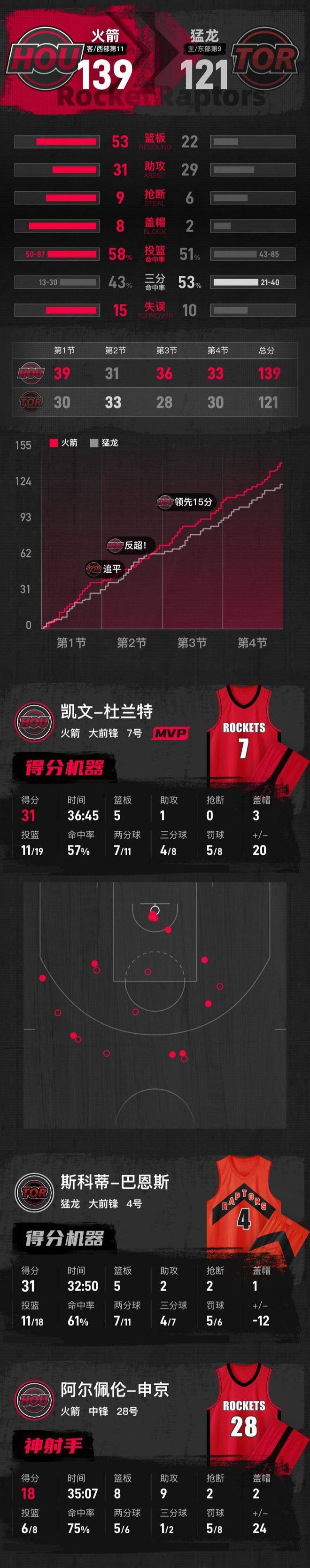 【UC体育战报】北京时间10月30日NBA常规赛,客场作战的火箭以139-121击败猛龙,猛龙遭遇4连败。杜兰特31分5篮板1助攻,申京18分8篮板9助攻。