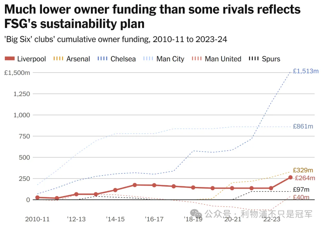 图表:远低于部分竞争对手的所有者注资反映了 FSG 的可持续计划。自 FSG 在 2010-11 赛季初收购利物浦以来,'Big Six' 俱乐部所有者注资的折线图,其中利物浦的 2.64 亿英镑低于其他三家,并显著低于切尔西和曼城。
