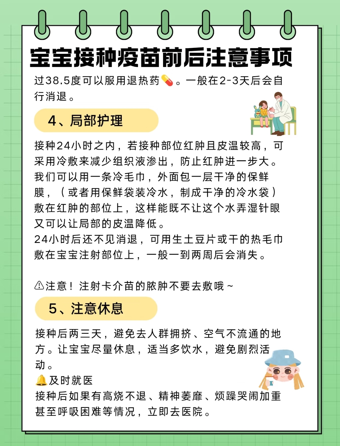 · 请在接种点留观至少30分钟。这是应对极少数急性过敏反应的黄金窗口。您可以利用这段时间给宝宝喂奶、换尿布,让他从刚才的紧张中彻底放松下来。