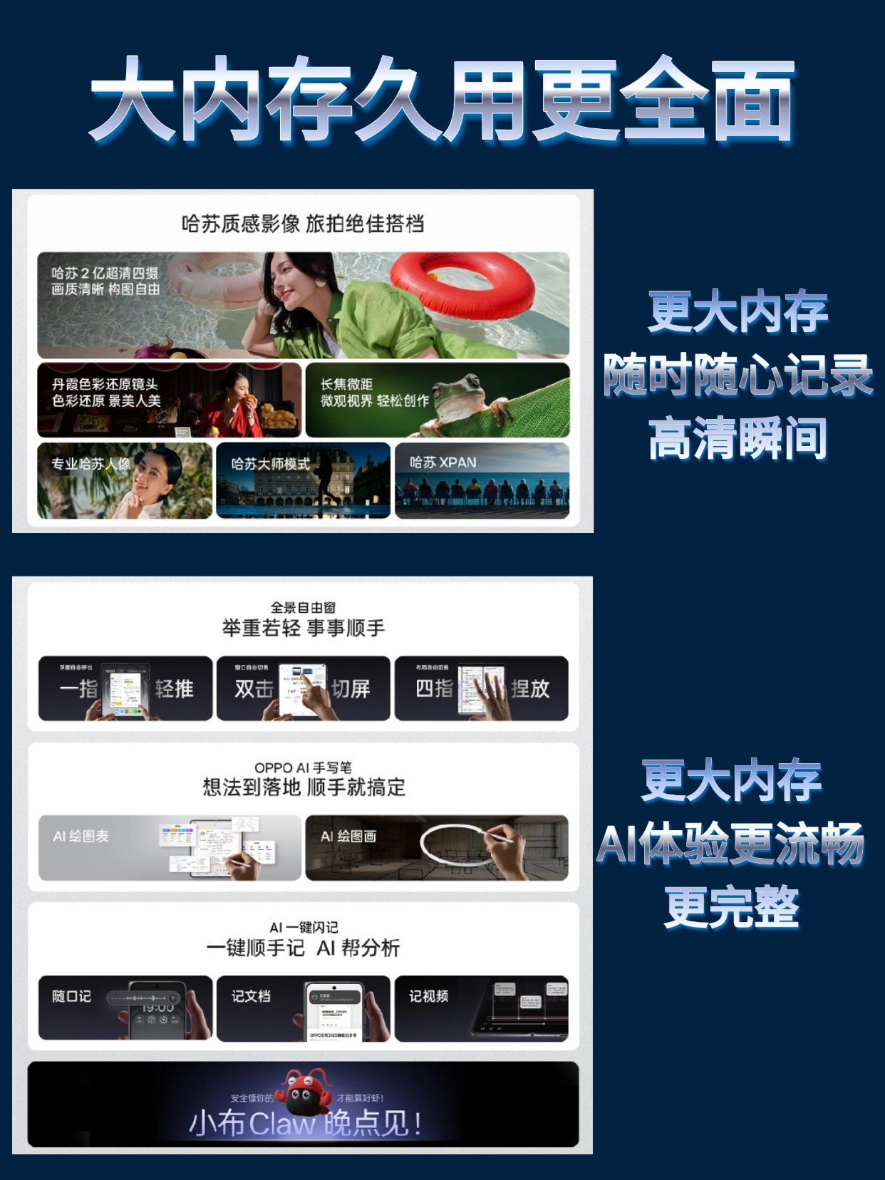 1、AI功能部署吃内存,更大的内存能为AI运算提供充足空间,像这一代OPPO Find N6就上线了众多实用好用的AI功能,想要AI体验更流畅、更完整,大内存大空间很有必要。