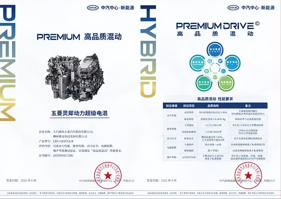 (“中汽中心高品质混动认证”证书)