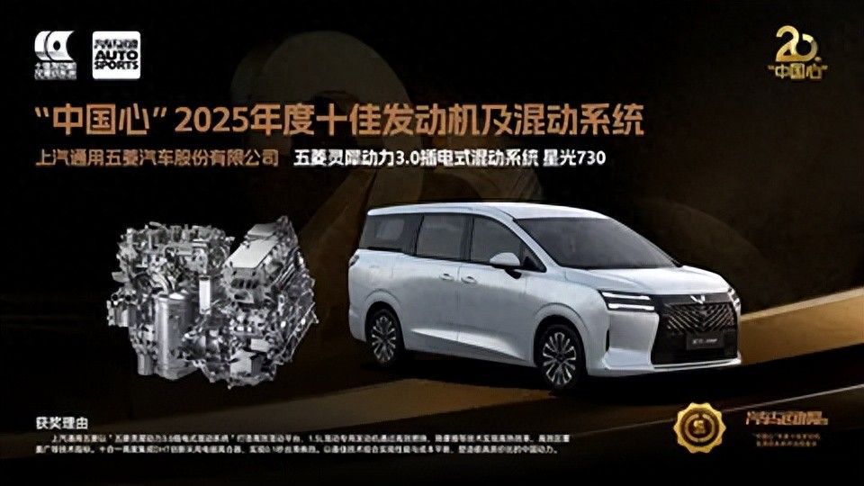 今日,上汽通用五菱旗下「全能舒享大7座」星光730首搭的灵犀动力3.0技术,凭借“超省、超强、超顺、超可靠”的卓越体验,以及行业领先的5.3L/100km超低亏电油耗(MPV车型),成功斩获“2025年度中国心十佳发动机及混动系统”、“中汽中⼼高品质混动认证”两项大奖。