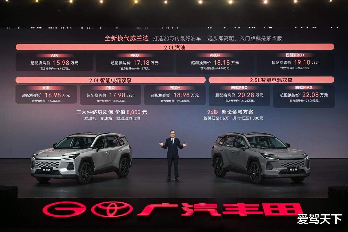 11月20日,广汽丰田全新换代威兰达正式上市,开启油车域控时代。威兰达此次换代,把用户普遍需要的中高配功能,直接下放为全系标配。值得一提的是,换代威兰达在上一代2.5L混动版基础上,此次还新增2.0L混动版本,行业内首次把中型SUV混动版价格拉进20万元内区间,性价比大幅提升。同时,换代威兰达此次还推出专属权益,全系可享1万元置换权益,价格来到15.98万元-20.28万元区间。