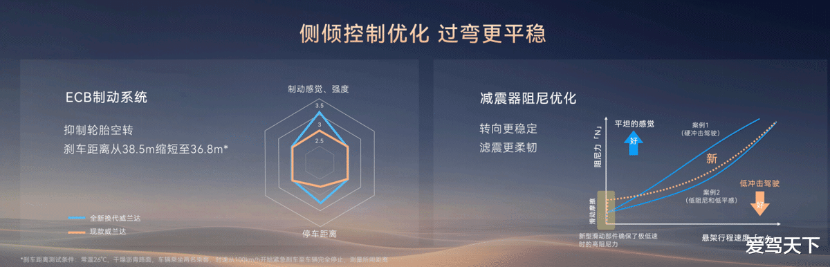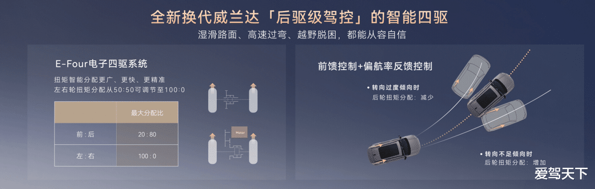当所有油车发布都在大肆说智能化的当下,换代威兰达重新把少数人提及的机械素质摆上桌面。全新威兰达E-FOUR电子四驱可以罕见实现前后轴驱动力100:0-20:80的智能调节,动力系统通过对四驱系统和悬挂的智能调控,让这台城市SUV在保持舒适的同时,具备了超越同级的操控稳定性和通过性,过弯更灵活、脱困更迅速。应用全新ECB电子控制制动系统,轮上扭矩分配更快更精准,大幅优化侧倾控制,实现了更线性跟脚的制动脚感,显著缩短制动距离,过弯更稳。