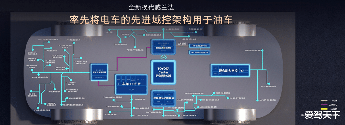 换代威兰达拥有行业独一无二的全域强控场、全域高算力、全域可进化能力,通过以一个域控制器统一管理和驱动各个模块的多个ECU高效运行,以一条千兆以太网打通信息壁垒,确保指令与数据实现毫秒级的高速交互,以一颗高通骁龙8155P高算力芯片确保海量数据能够被实时处理,以软硬件解耦实现OTA升级能力的飞跃,既能底层固件FOTA,也能应用软件SOTA。从拥有上百个ECU的“功能汽车”,到由强大域控制器驱动的“智能汽车”,换代威兰达直接让油车也能拥有新能源车的智能体验,全域打通,直接打破油车无智能偏见。
