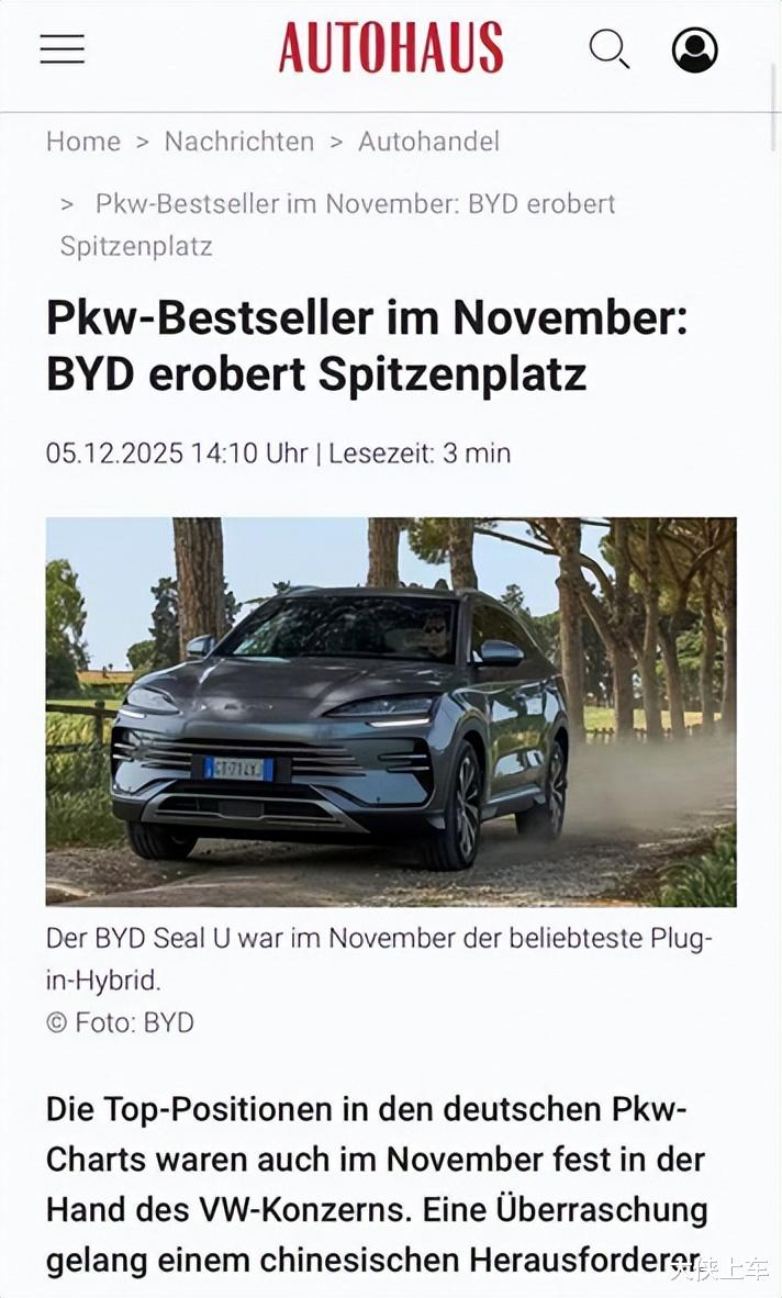 如果你还以为中国车只是“性价比高”“配置堆料”,那今天的消息可能会颠覆你的认知。比亚迪宋PLUS(海外命名为SEAL U)在德国拿下11月插电混动车型月度销量冠军!这不是在某个小众市场试水,而是在汽车工业的发源地、全球最成熟的汽车市场之一德国,中国品牌首次登顶主流细分市场。