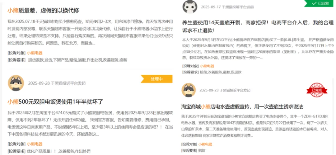 此外,黑猫投诉榜单有关小熊电器的投诉累计接近3000万条,不少投诉是有关产品质量的,可见小熊电器在品控方面存在诸多问题。