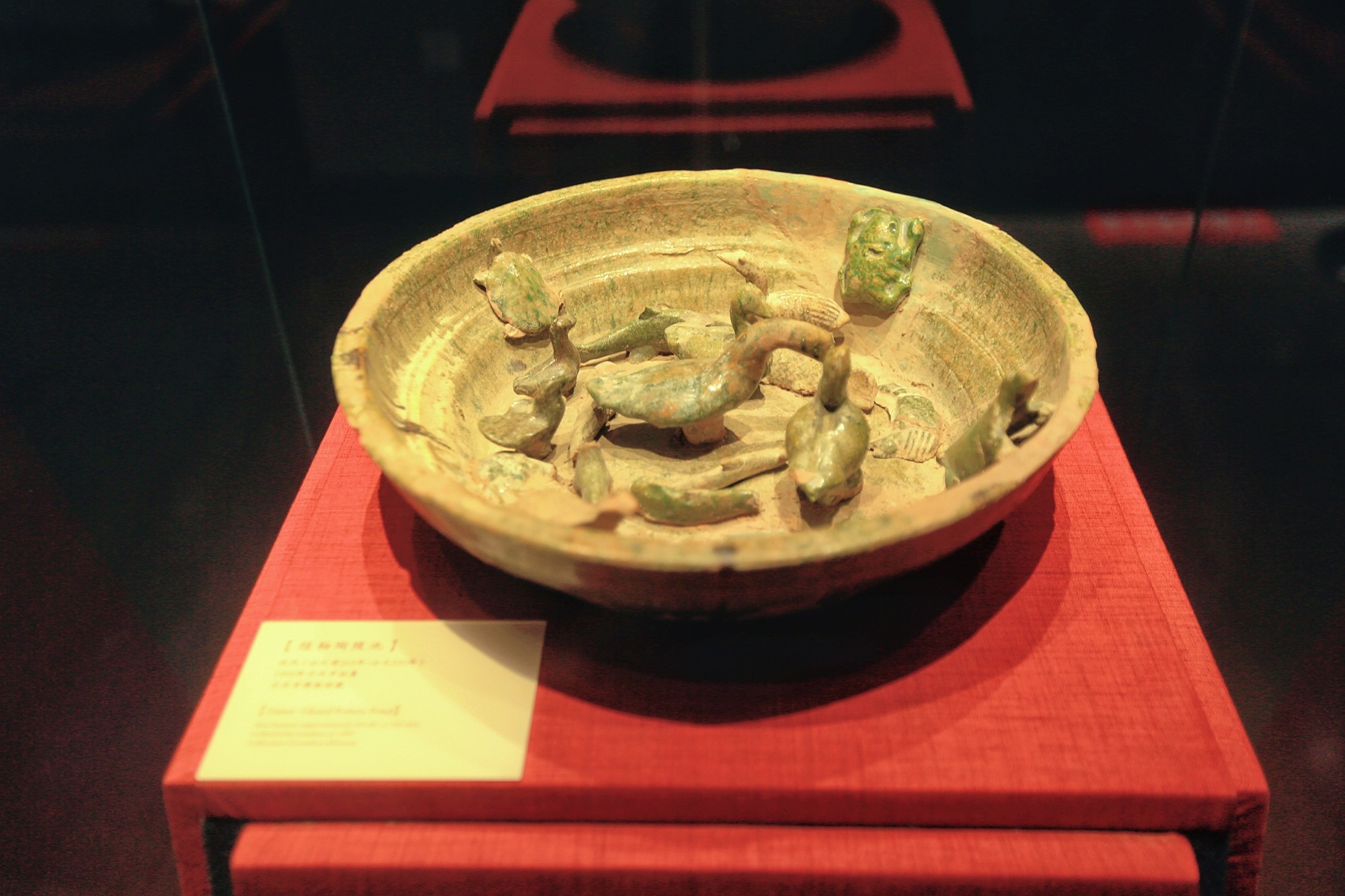 汉代的陶器制作手艺早已不是新石器时代可以比拟,绿釉陶水塘中,盘沿及塘中的乌龟、鸭子等姿态各异,生动活泼,精美得让人忍不住近距离细细观赏。