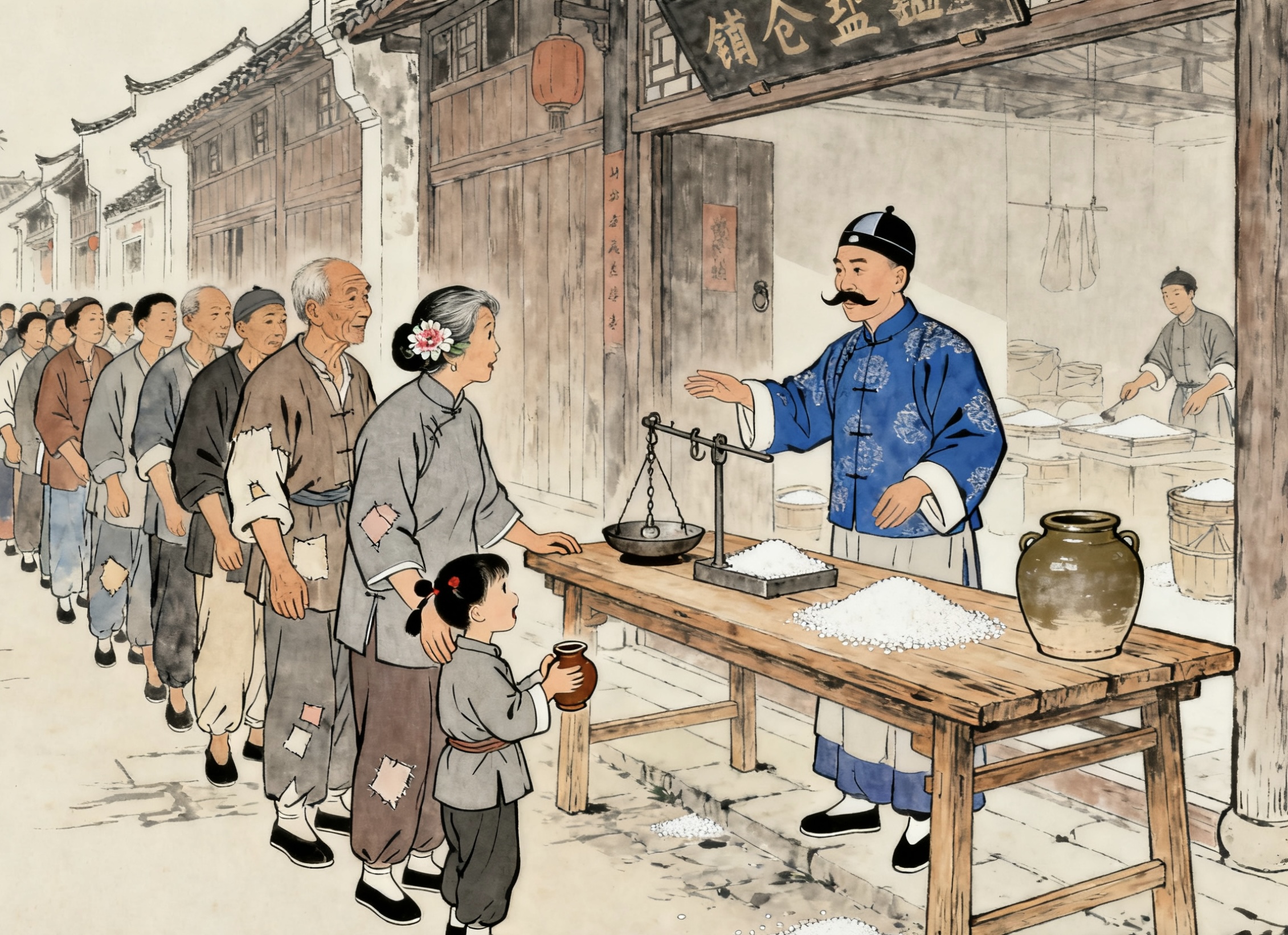 青溪镇就一家盐铺,老板姓张,是个出了名的 “铁公鸡”。这年入秋,连着两个月没下雨,运河水浅,运盐的船过不来,张盐商眼珠一转,干脆把盐铺的朱漆大门一关,门环上挂了块 “盐尽待补” 的木牌,实则把上千斤盐都藏进了后院的地窖里。