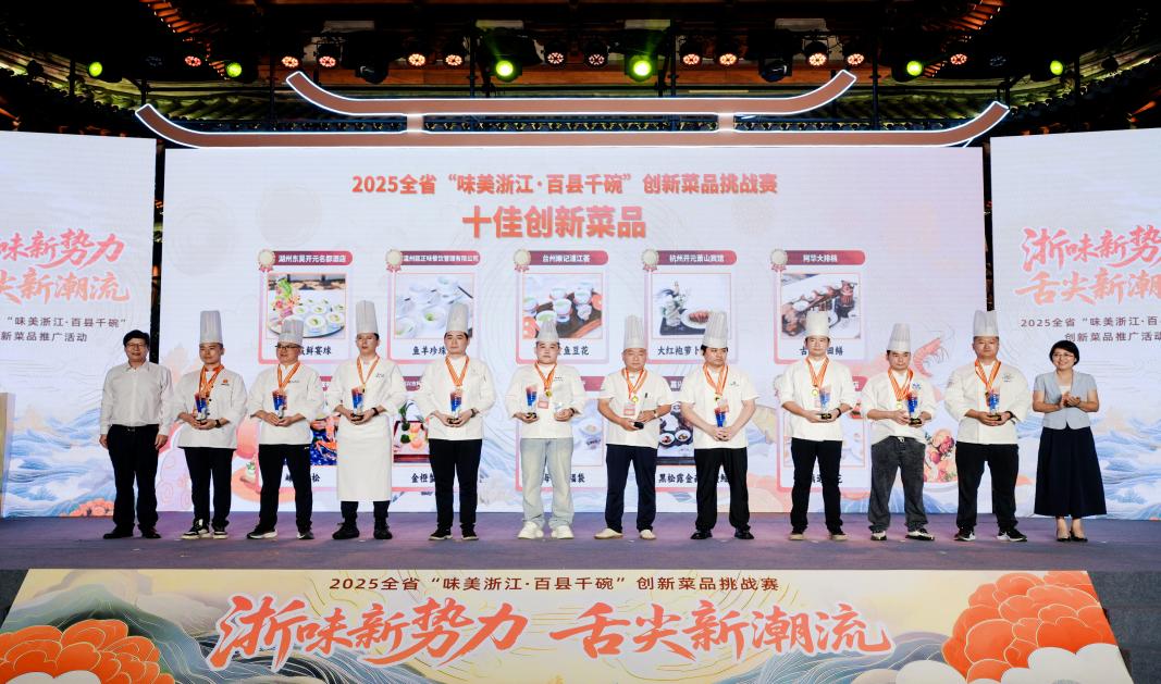 《十佳创新菜品》颁奖现场 左六为郑建斌 丽水开放大学供图