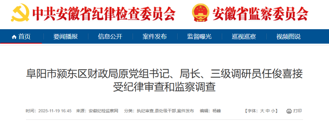 据“安徽纪检监察网”11月19日消息,阜阳市颍东区财政局原党组书记、局长、三级调研员任俊喜涉嫌严重违纪违法,目前正接受颍东区纪委监委纪律审查和监察调查。(阜阳市纪委监委)