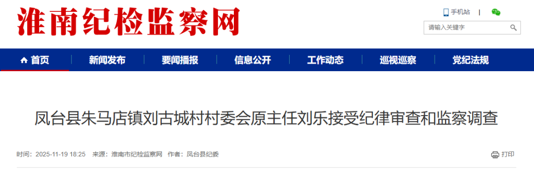据“淮南纪检监察网”11月19日消息,凤台县朱马店镇刘古城村村委会原主任刘乐涉嫌严重违纪违法,目前正接受凤台县纪委监委纪律审查和监察调查。(凤台县纪委监委)
