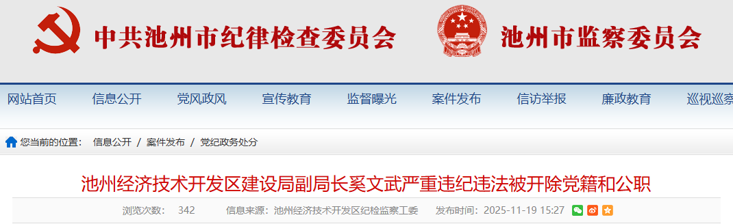 据“池州纪检监察网”11月19日消息,日前,经池州市纪委监委指定管辖,青阳县纪委监委对池州经济技术开发区建设局副局长奚文武严重违纪违法问题进行了立案审查调查。