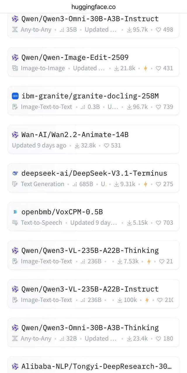 而这种生态优势,也正在转化为全球影响力。据Hugging Face最新数据显示,中文开源模型的fork量在9月增长180%。9月Hugging Face榜单显示,阿里通义7款模型占据全球前十开源模型席位,Qwen3-Omni 登顶榜首,标志着中国从“开源参与者”升级为“生态定义者”。