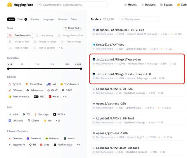 模型刚发布完,Ring-1T-preview就登上了开源社区Hugging Face模型趋势榜第三,第四名也是蚂蚁inclusionAI社区的Ring-flash-linear-2.0。