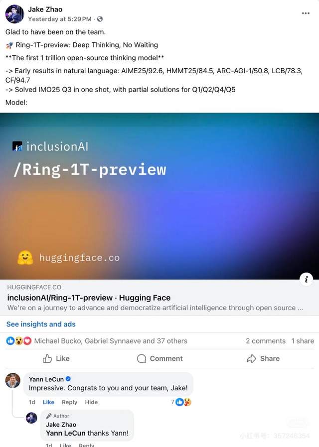 中国大模型也引起了图灵奖得主杨立昆的关注。就在9月30日,蚂蚁集团旗下百灵大模型宣布开源其思考模型Ring-1T的预览版Ring-1T-preview,参数量达1000B(1万亿)。“令人印象深刻,祝贺你们的团队。”在百灵最新思考大模型发布后,杨立昆在社交平台上也给中国大模型点了赞。