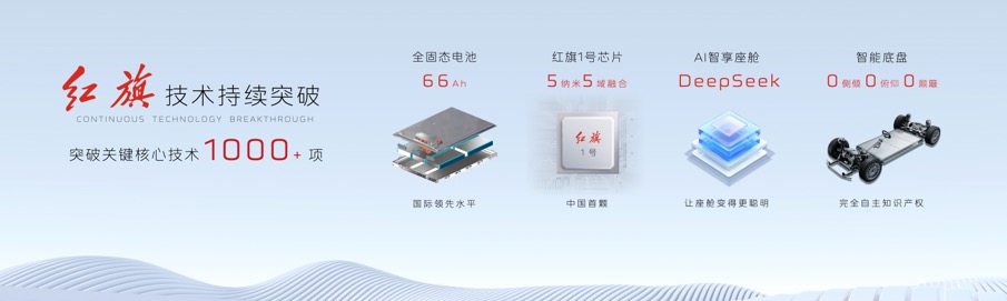 自2023年全面、全方位、全体系向智能网联新能源汽车转型以来,红旗品牌紧紧围绕国家所需、产业所急、用户所想聚力攻坚,突破关键核心技术1000余项,已经完成66Ah全固态电芯试制及验证,主要指标国际领先;推出中国首颗车规级、5纳米五域融合芯片——“红旗1号”;引入DeepSeek等大模型技术,打造智慧场景大脑;同时研发了拥有完全自主知识产权的全主动智能底盘。通过一系列技术的创新应用,红旗品牌打造了“天工”纯电、“鸿鹄”混动、“九章”智能三大技术平台,为红旗品牌的持续跃迁打牢了坚实技术底座。