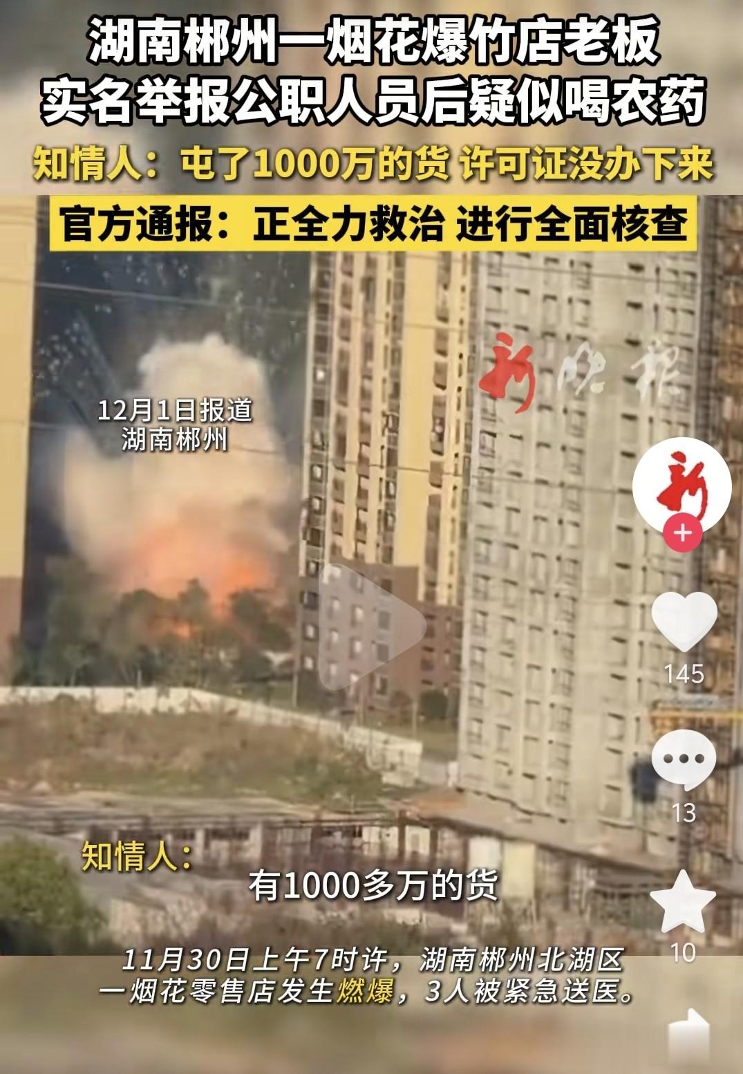 此前在烟花店燃爆之前,店主曾经举报某个制服人员违法违纪,说的就是办理烟花销售许可证都是XX。30日网上就有但是相关部门没回应,12.1日郴州市联合调查组通报已多部门介入调查,会依法依规办理。