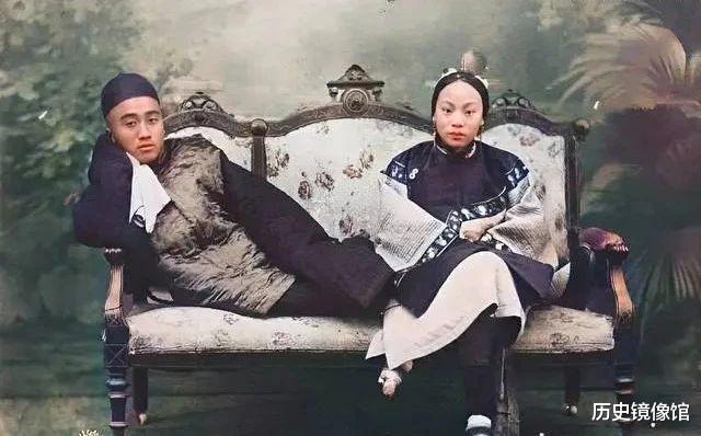 这张晚清照相馆中的夫妻合影,身着传统服饰,裹着小脚的女人坐在绒布沙发上,是清末社会转型与摄影技术初入中国的独特见证。
