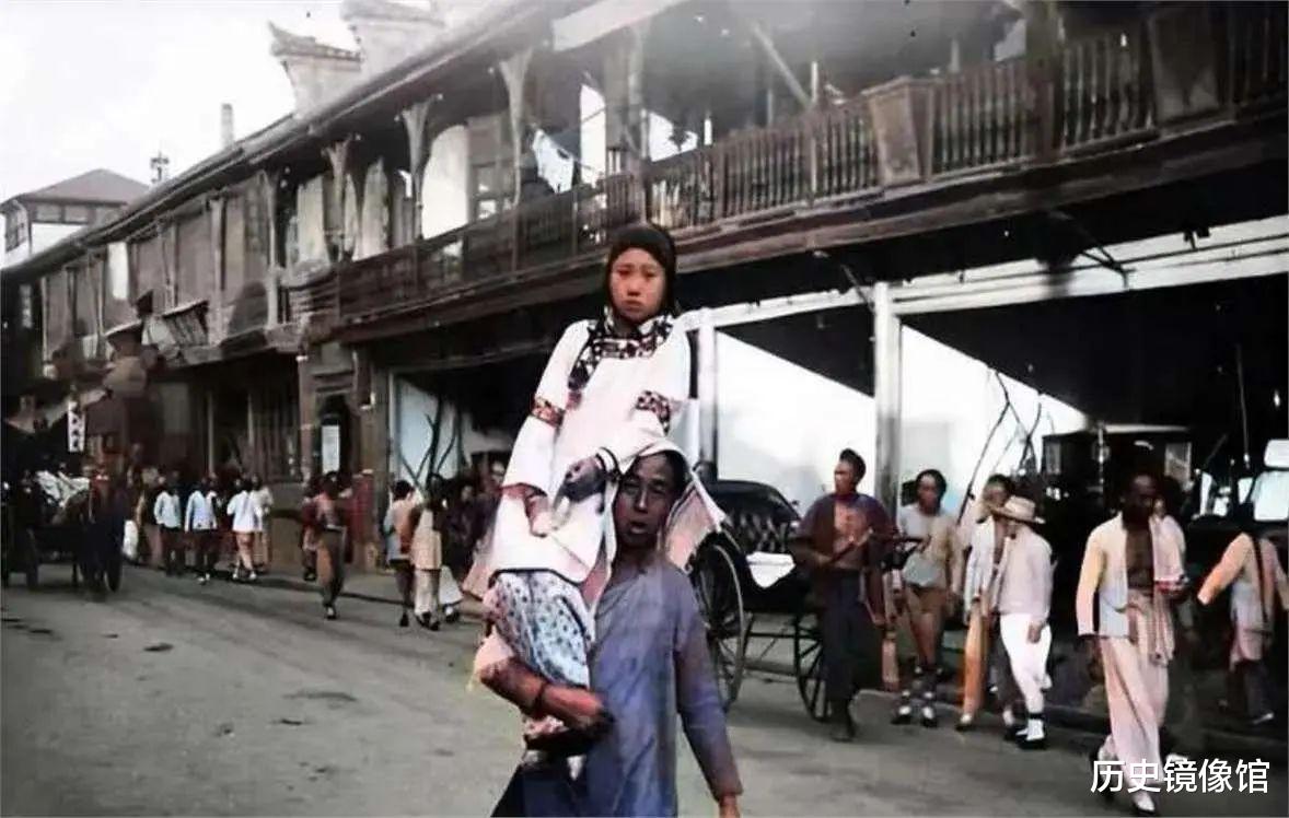 画面中,一名缠足雏妓蜷缩在男性杂役(即“龟奴”)肩头,被驮往接客场所。照片中女孩约十岁上下,与史料记载“最小的仅七八岁”相符。她们尚未发育完全即沦为性商品。