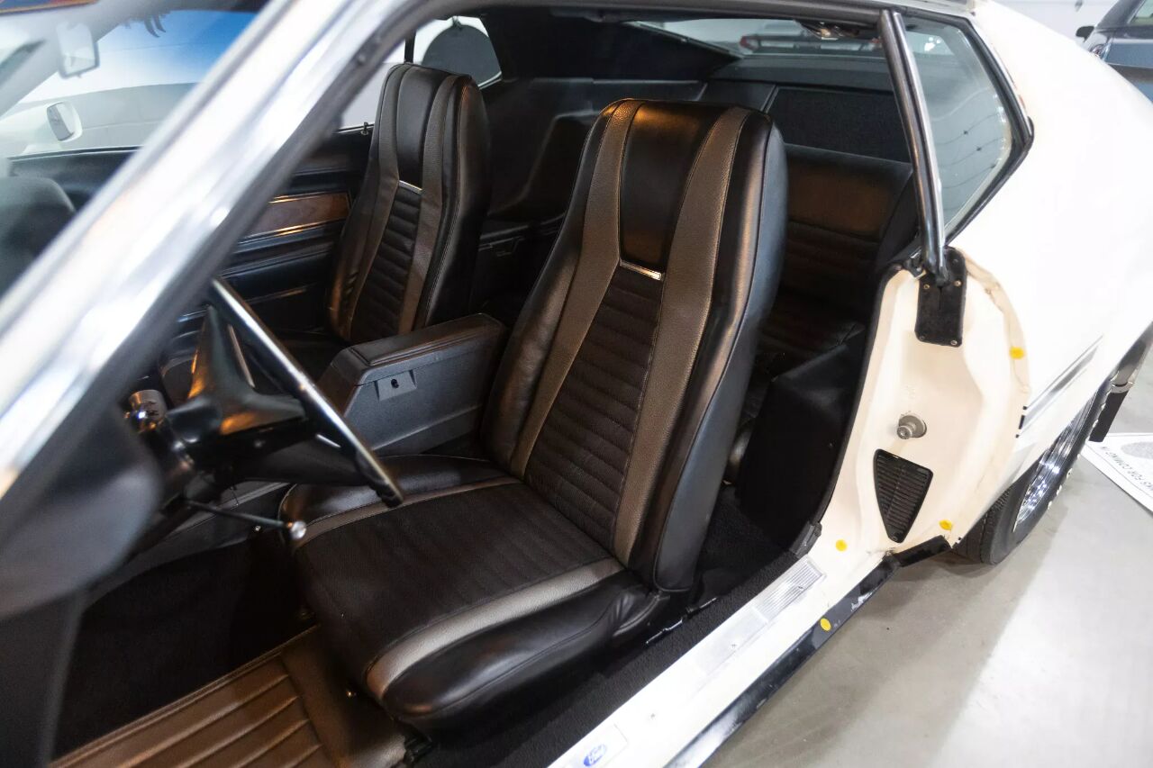 这台Mustang Mach 1的外观堪称完美复刻了半个世纪前的出厂风貌。车身选用纯净的白色涂装,搭配侧身标志性的黑色饰条,黑色后扰流板与拉姆空气进气引擎盖相得益彰,在展现肌肉车凶悍气场的同时,也强化了空气动力学性能。
