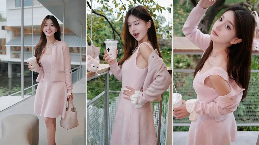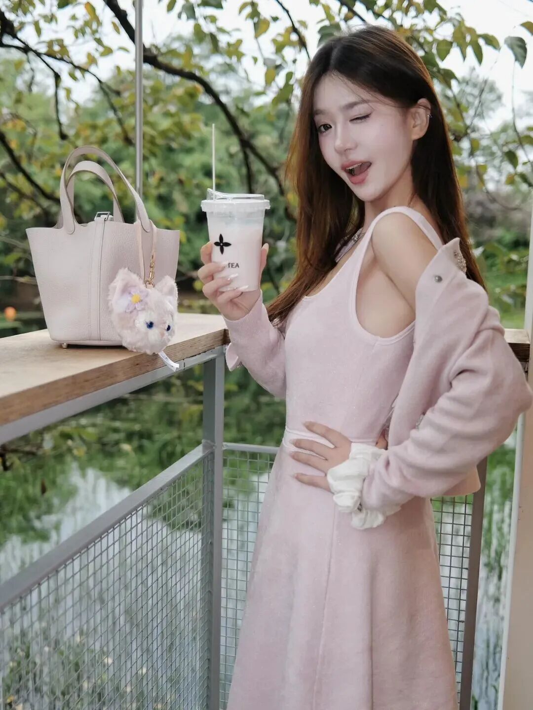 人物一手叉腰,一手持饮品,姿态娇俏而充满活力,身旁的手提包和萌趣挂饰丰富了画面层次。这种“互动pose+道具组合”的搭配,在绿意背景的衬托下,既凸显穿搭细节,又洋溢着甜妹氛围感。往栏杆边一靠,轻松拍出让人忍不住点赞的元气大片。