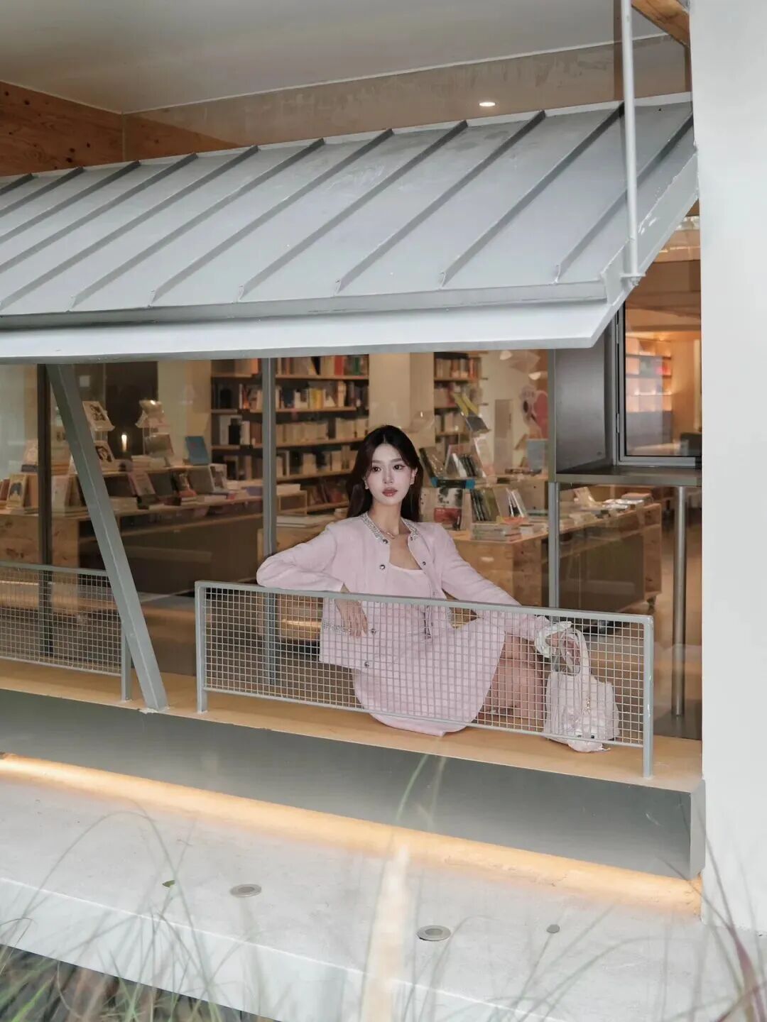 人物以松弛的坐姿倚在栏杆旁,一手自然搭在围栏上,身旁的手提包为画面增添精致感。利用书店的玻璃建筑作为背景,这种“场景融合+慵懒坐姿”的搭配,既凸显穿搭优雅,又满是文艺氛围。往这儿一坐,随手一拍便是自带故事感的时尚大片。