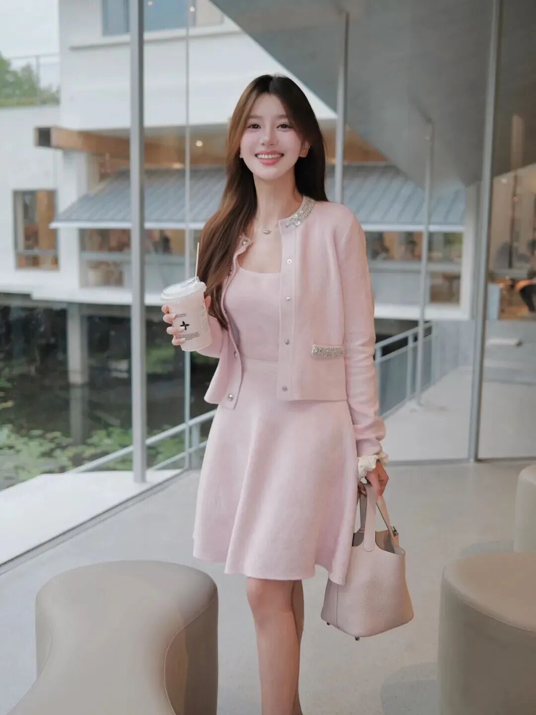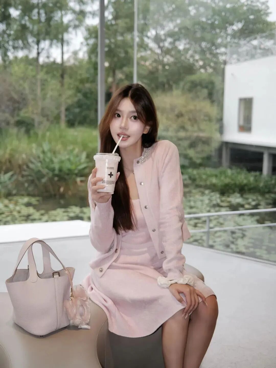 人物以自然站姿呈现,一手持饮品,一手拎手提包,画面充满生活气息。在现代感建筑背景的映衬下,这种“日常互动+穿搭展示”的pose,既彰显优雅气质,又能突出服装细节。随便往室内一站,便能拍出兼具时尚与亲和力的大片,优雅女孩们,快get起来!