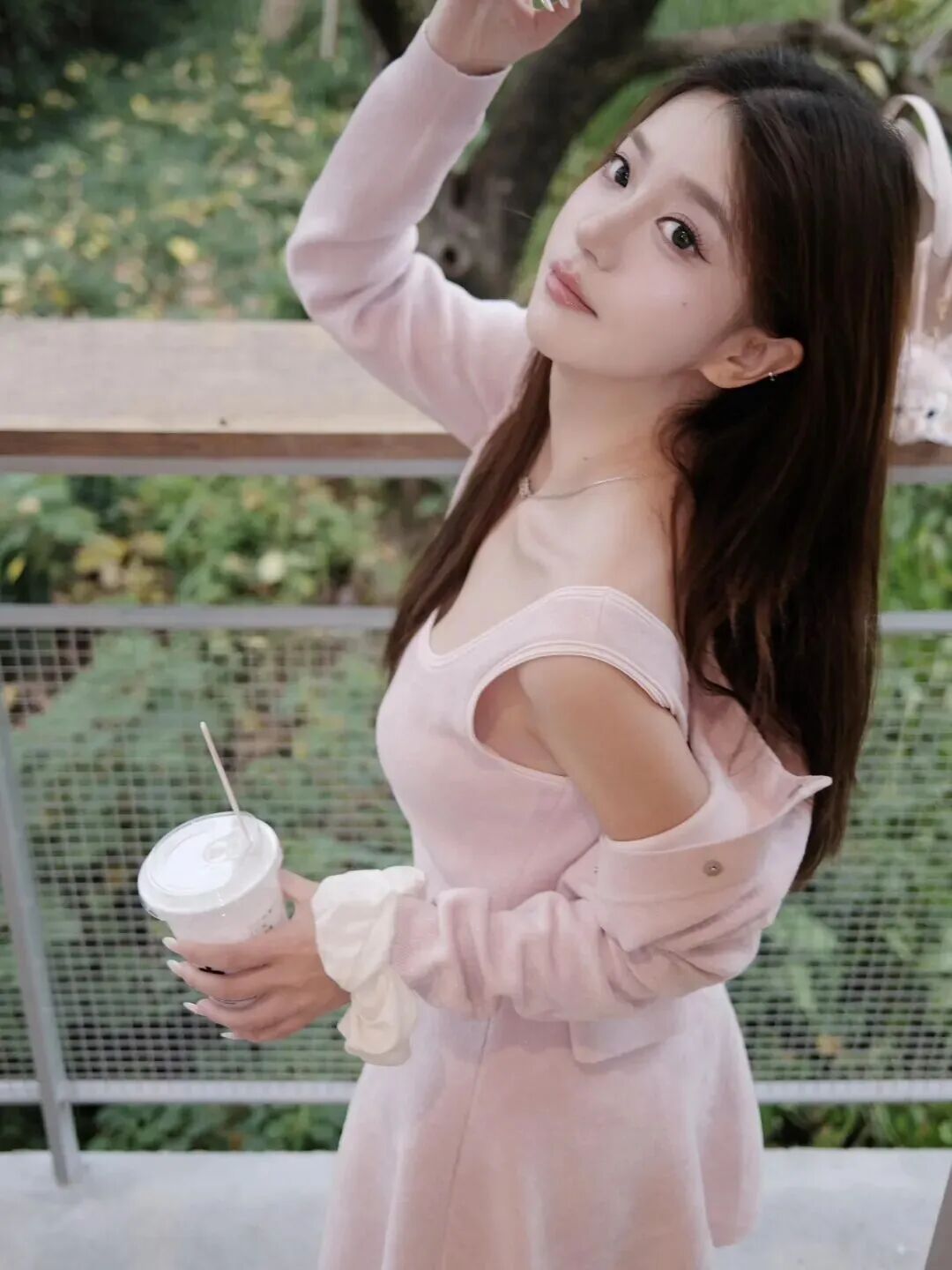 人物微微仰头,与镜头展开一场不经意的互动,一手高举,一手轻握饮品,肢体动态充满活力。斜肩穿搭巧妙展露精致肩颈线,搭配自然的侧身角度,在绿意背景的映衬下,既凸显穿搭细节,又洋溢着温柔氛围。这种“动态pose+道具加持”的组合,轻松拍出又甜又飒的画报感,让人爱不释手。
