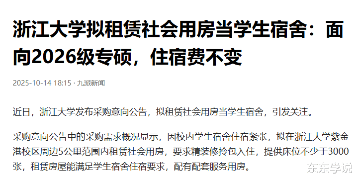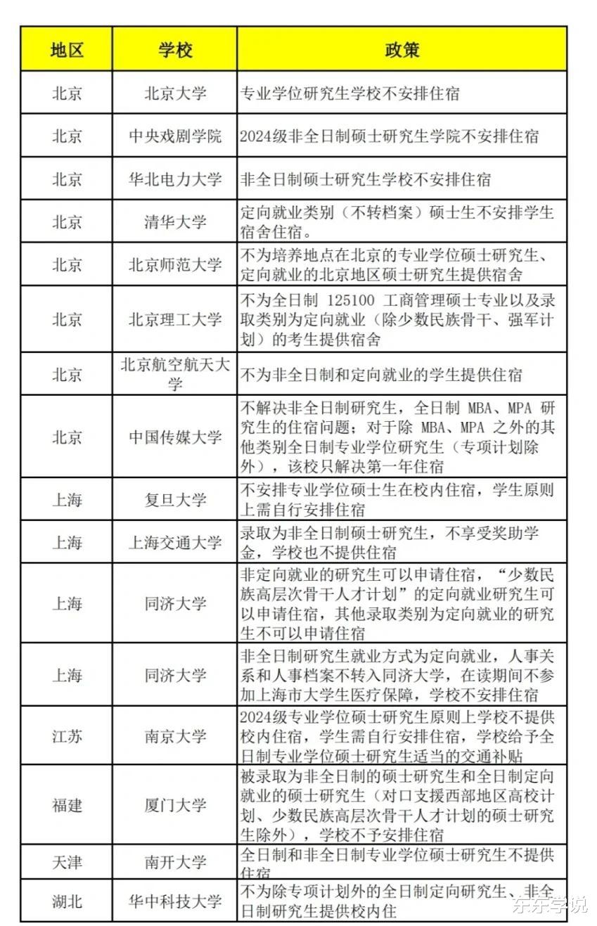 北京大学、复旦大学、浙江大学、南京大学等知名高校均发布通告,将不再向2026届专硕生提供宿舍。很多一线城市一年租房需要2-5万,这个成本部分家庭难以承受!
