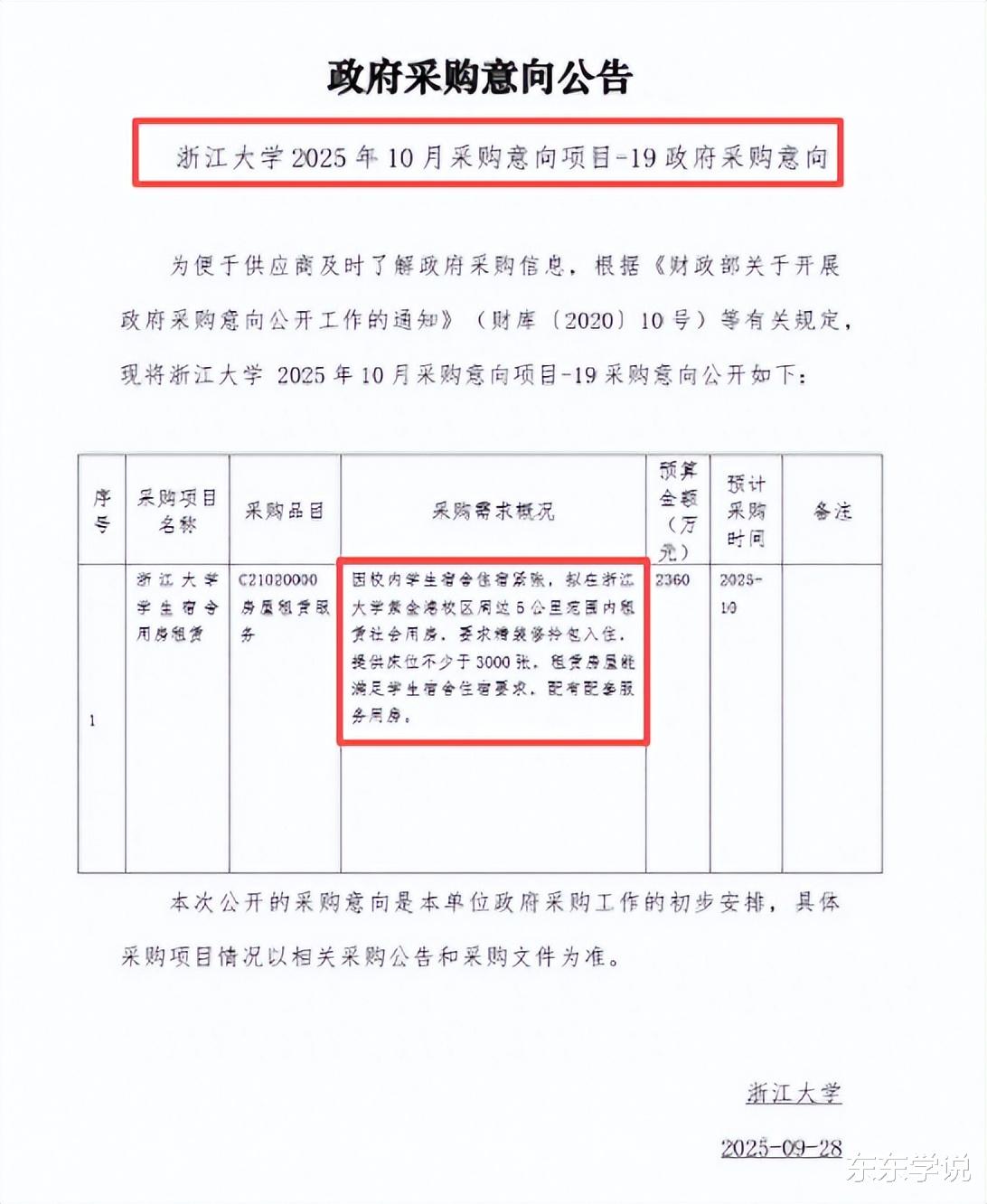 不过这事引来转机,浙江大学紫金港校区拟在学校周边5公里,租赁拎包入住型社会用房当学生宿舍。
