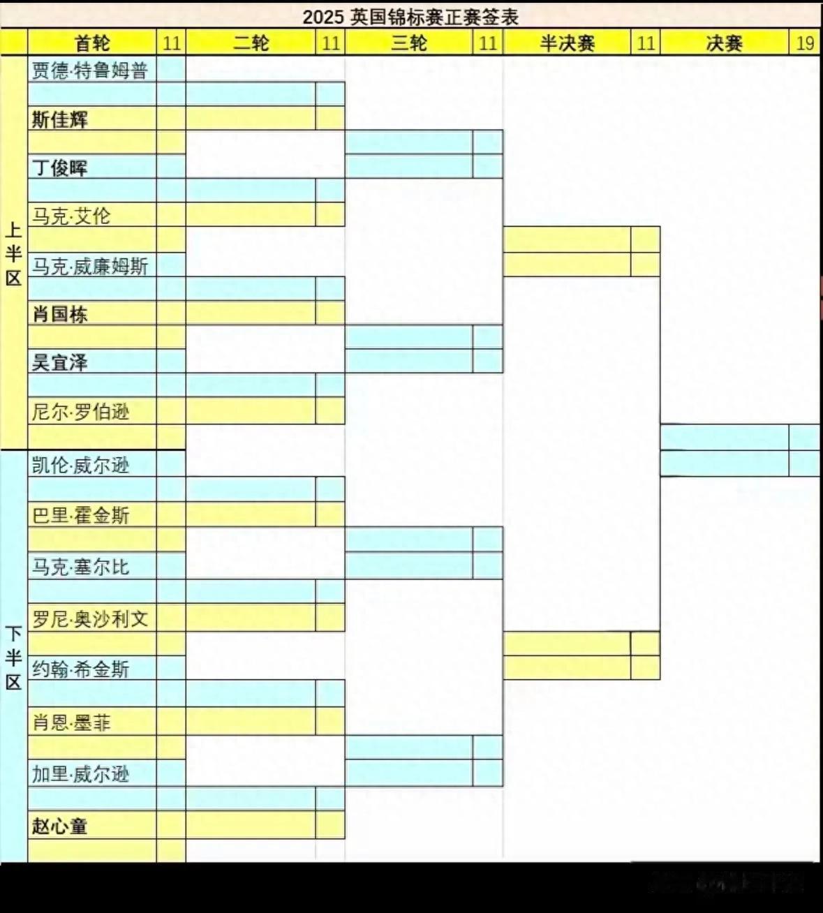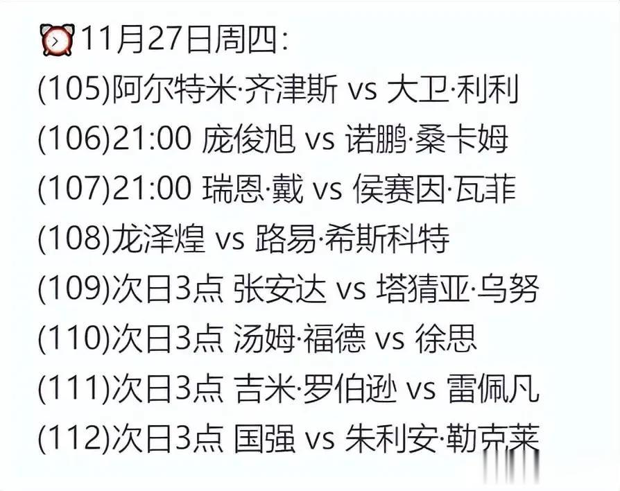 正赛首轮1/16决赛,三场中国德比战:丁俊晖vs徐思、庞俊旭vs肖国栋、龙泽煌vs赵心童,中国军团至少锁定三个16强席位。28日7:20结束的比赛,中国军团张安达、徐思、雷佩凡晋级正赛,贺国强出局!12人入围正赛创造参加英锦赛人数最高记录!