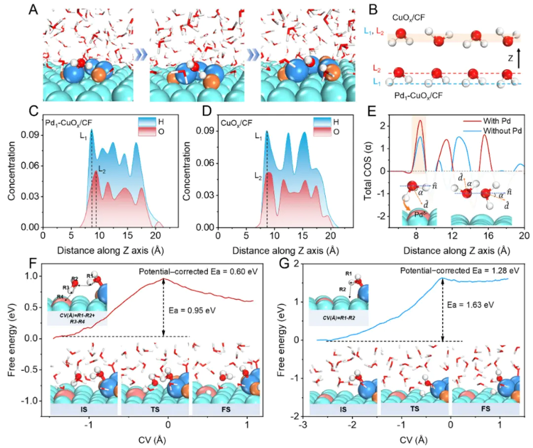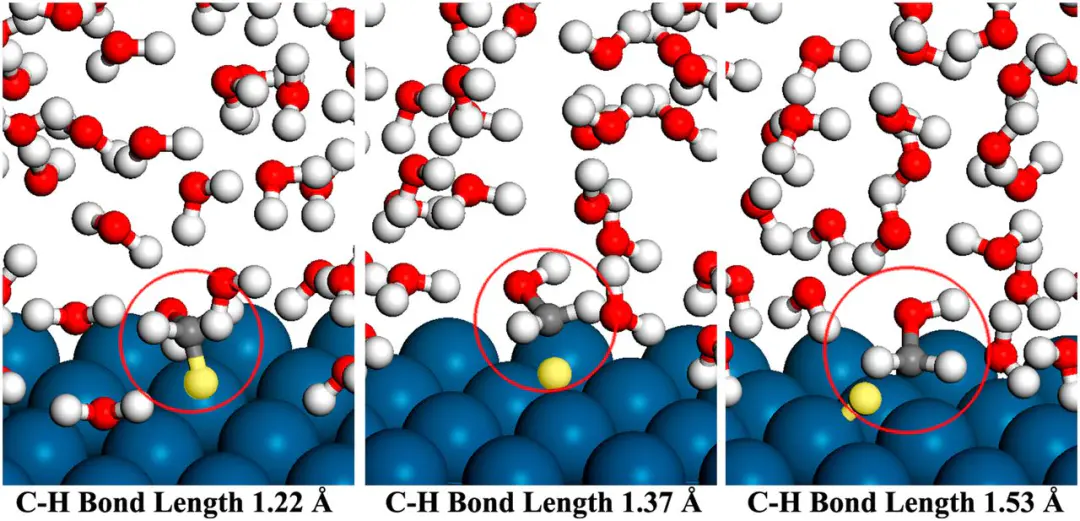 电催化研究AIMD的重要应用领域。在电极–电解质界面,反应中间体的吸附、转移与转化往往涉及复杂的溶剂效应与电荷转移过程。常规静态计算方法往往将电极与溶液分离处理,难以捕捉真实的动力学过程。而限制性AIMD能够在显式水分子、电极表面与反应物共同作用下,通过对关键反应坐标的限制,逐步描绘出完整的反应自由能曲线。