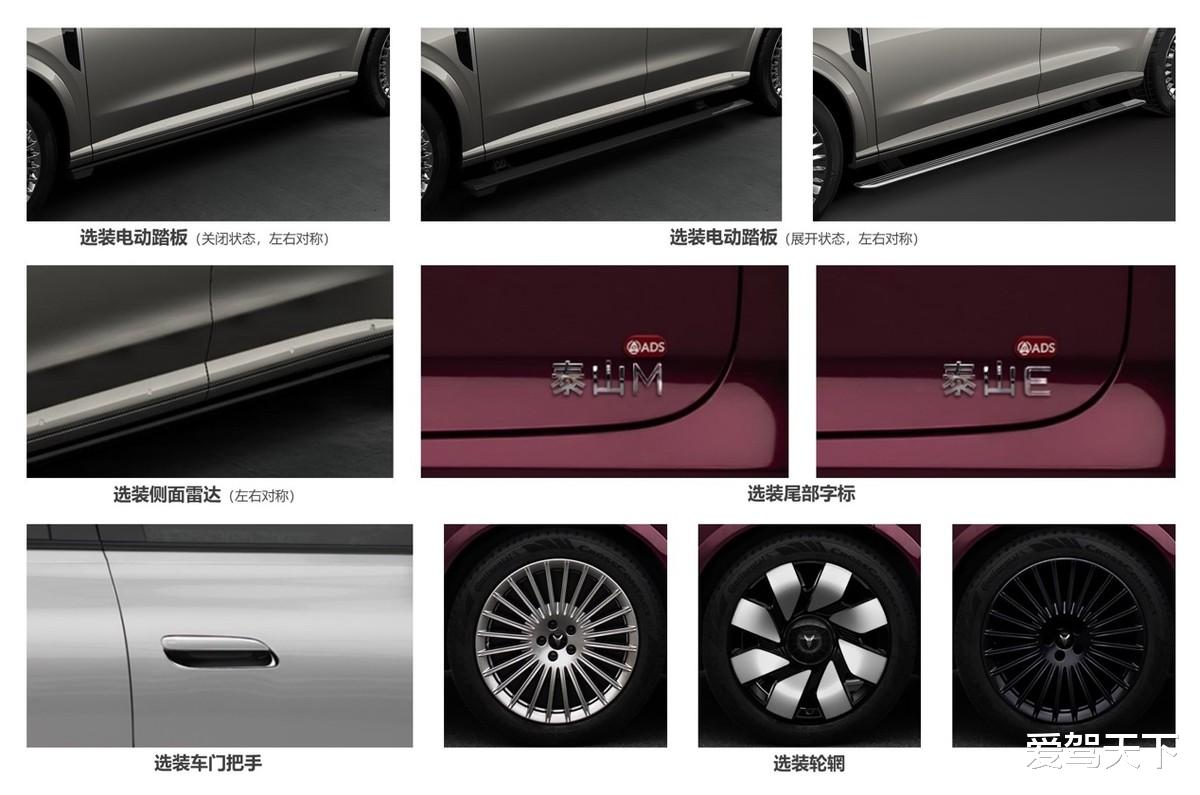从申报车型配备的激光雷达和“ADS”尾标来看,泰山8仍然会搭载华为乾崑智驾。动力上,泰山8继续搭载1.5T插混系统,除了申报与泰山同款的150/230kW双电机四驱+三元锂电池版本外,还新增了一款150/215kW双电机四驱+44.5kWh磷酸铁锂电池版本,纯电续航为190km。