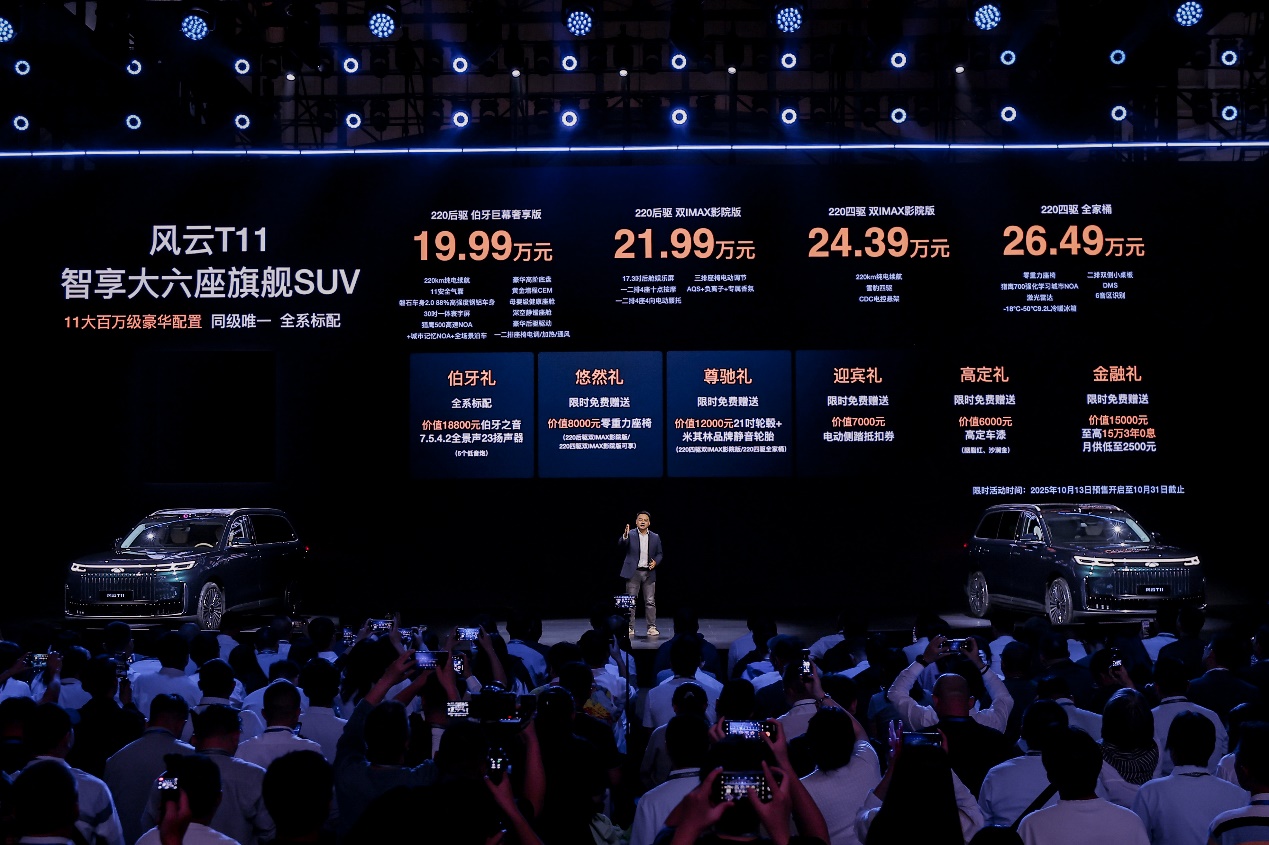 2025年10月13日,以“兑现”为主题的风云T11家庭品鉴日暨预售发布会在安徽·芜湖隆重圆满收官。作为风云品牌焕新后的首款旗舰级 SUV,风云 T11 定位为 “智享大六座旗舰 SUV”。新车以“顶格对标”为理念,凭借“超大更好”四大核心价值、三大沉浸式场景与11大全系标配,重新定义了家庭出行豪华体验,兑现中国家庭对品质生活的全维期待。