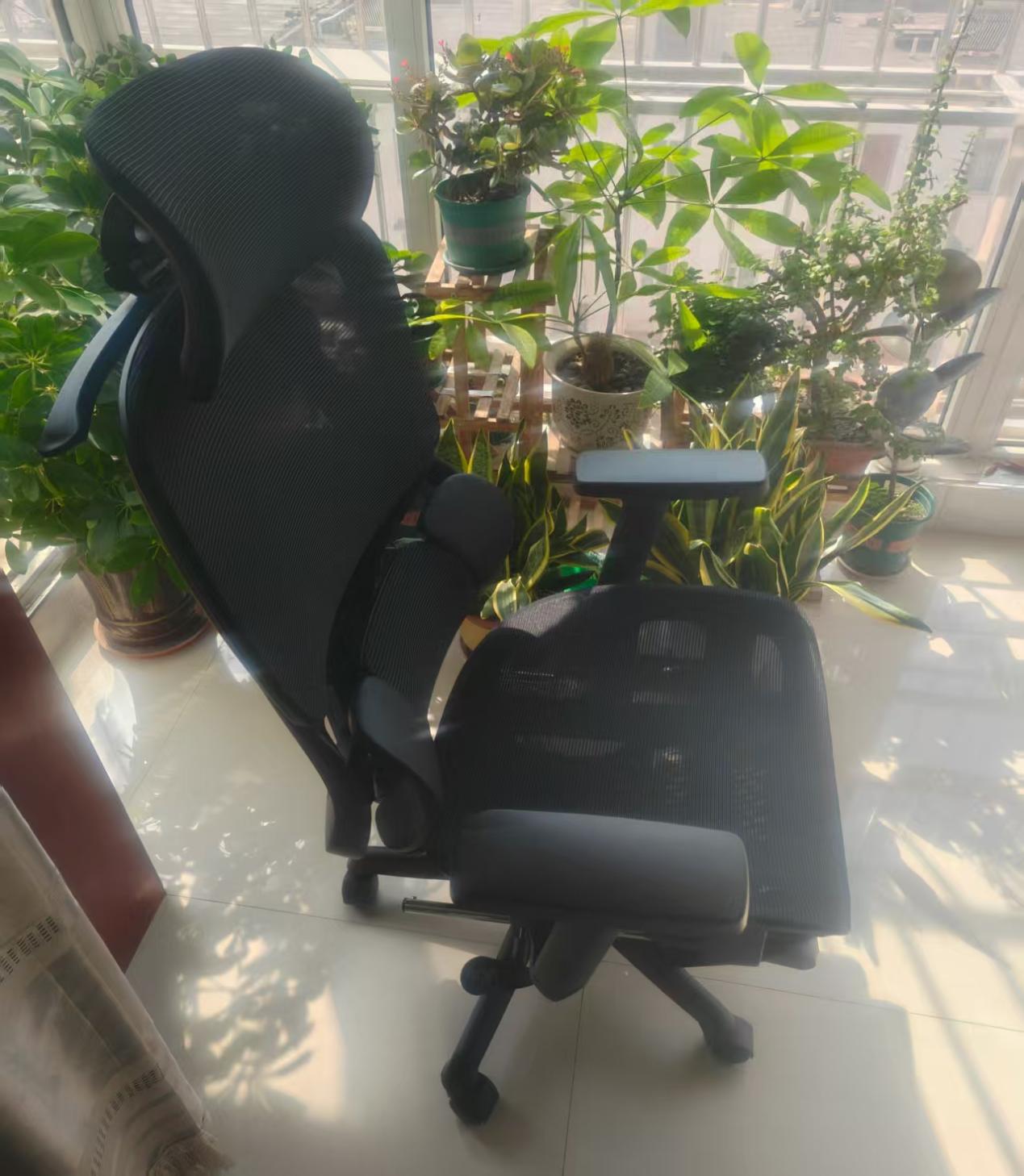 这把椅子不仅高度可以升降,还具有第六代重力联动底盘,通过机械传导器可自行根据体重自动调节后仰反馈力度。搭配145°无极后仰,同时配有隐藏式可伸缩腿托,通过腿部承托延伸系统,从头、背、腰、臀、腿的五区全部都有支撑,瞬间秒变午休神器。