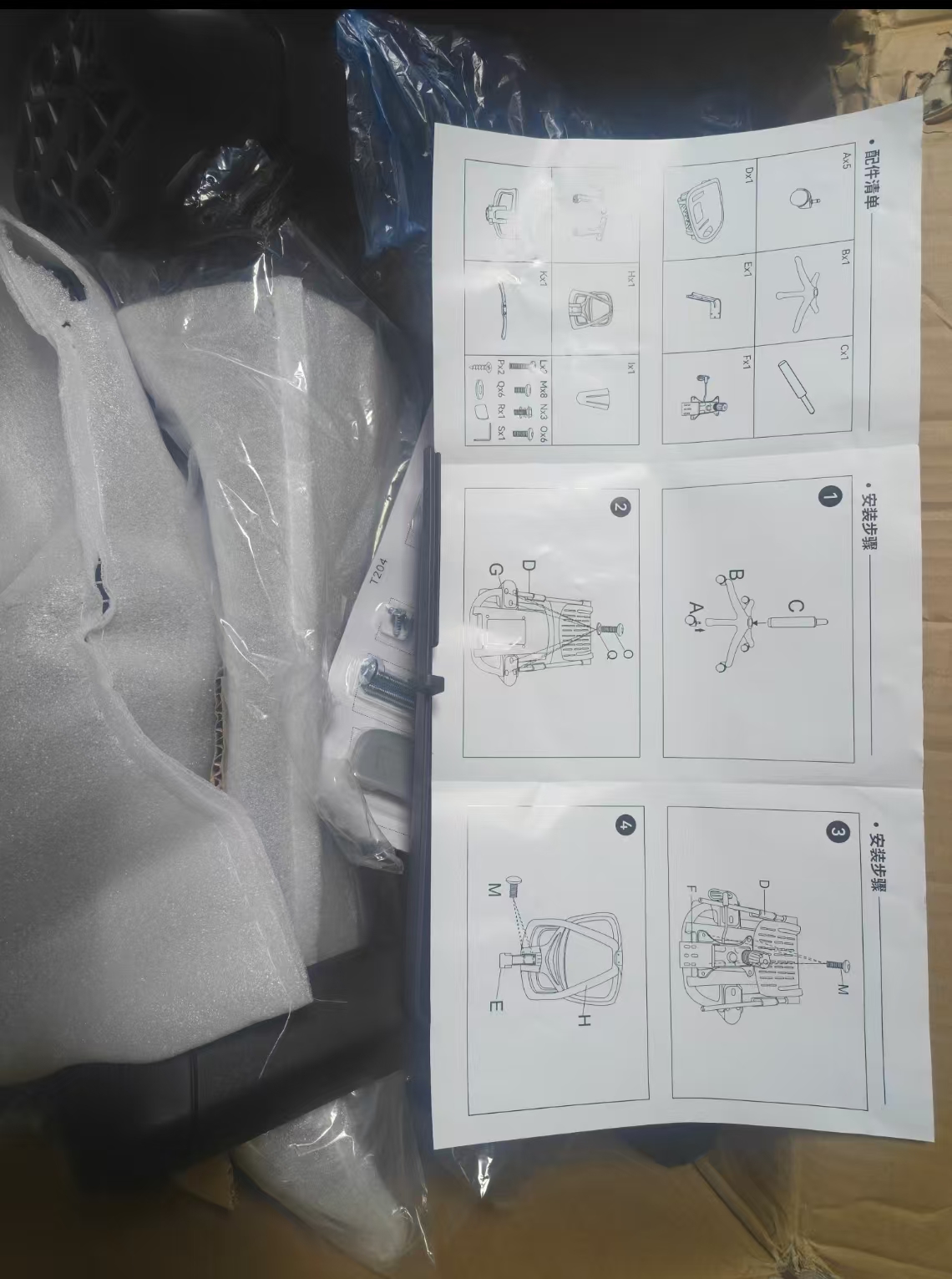 首先开箱,一箱子的椅子配件,还有一张说明书详细的介绍了安装的步骤,这就方便多了。