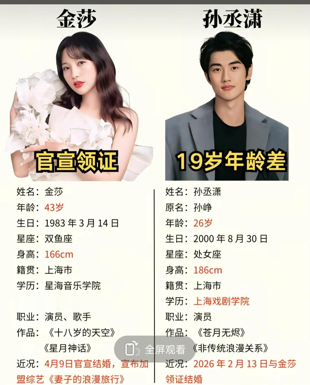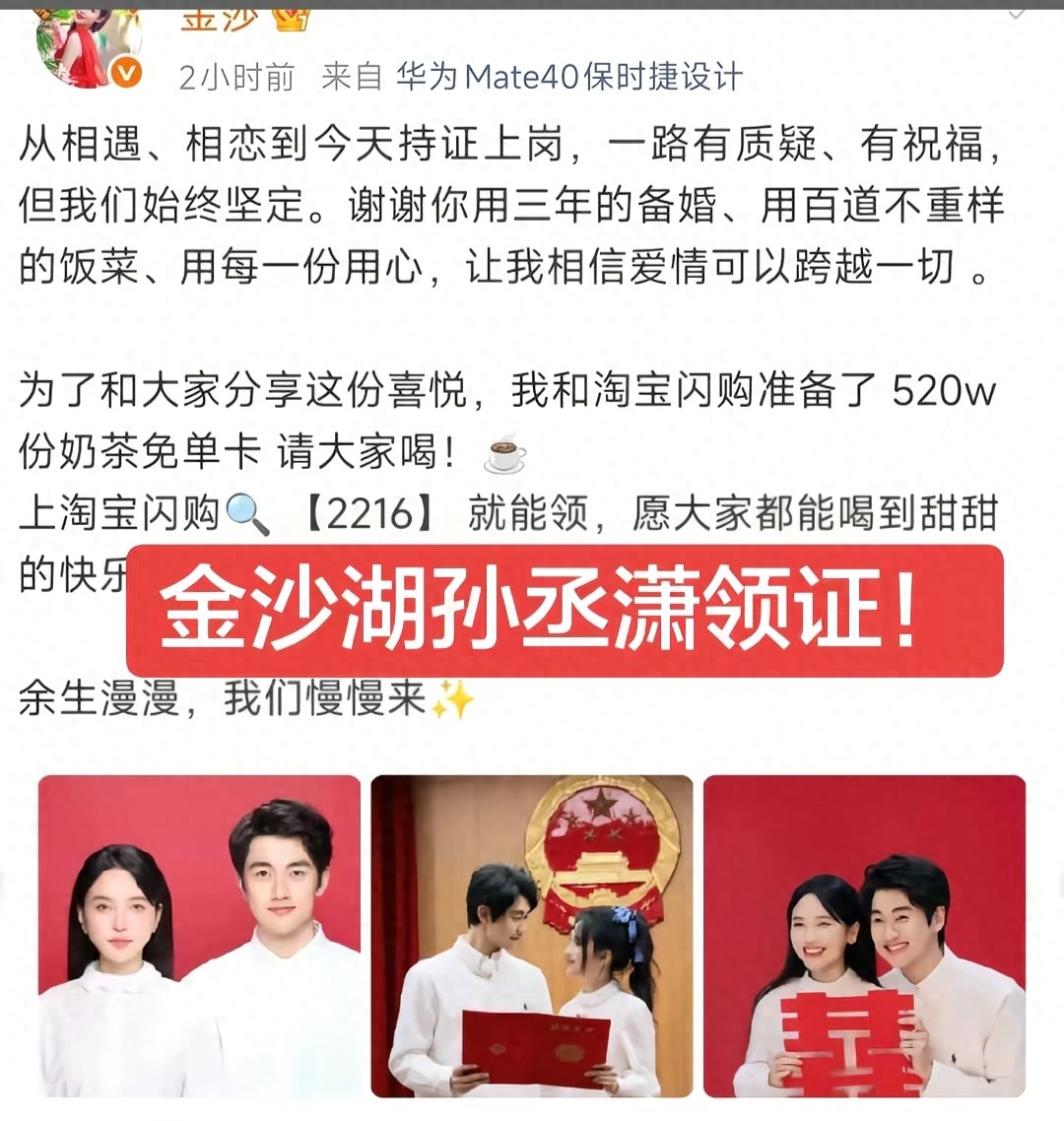 甜美女神金莎官宣领证了,老公还是3年前不被看好的那个年轻小伙子,两人相差19岁,是我们世俗的“母子恋”。但是这一对就这么彼此看对眼了,不是谈谈恋爱,人家真领证了。女神在好好爱自己,男生也在认真体验生活。看好吗?