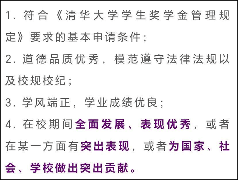 在评定规则上,除了品行良好、学风端正等基本申请条件之外,还要求申请人“在校期间全面发展、表现优秀,或者在某一方面有突出表现,为国家、社会、学校作出突出贡献。”