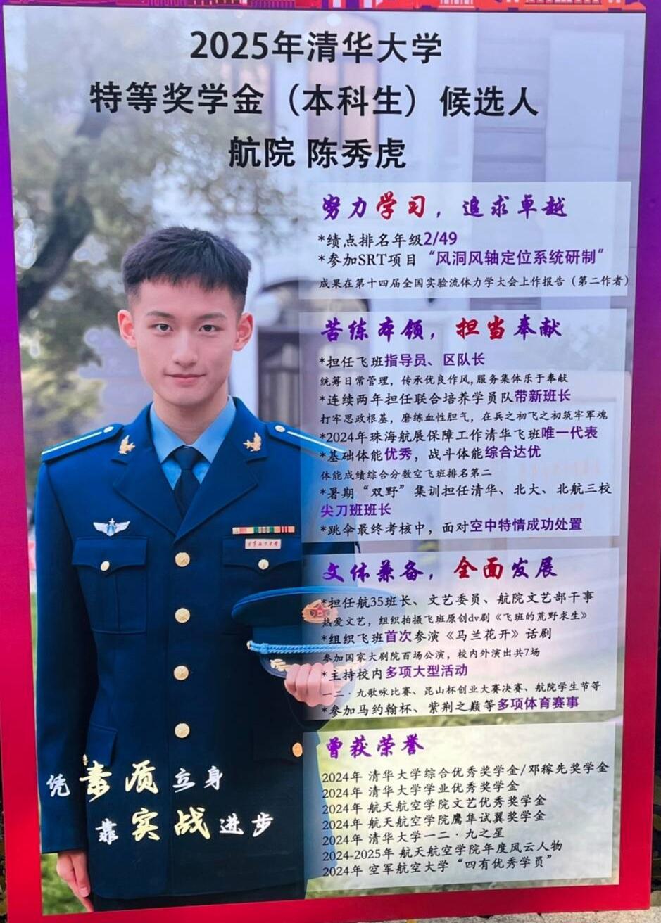 值得一提的是,陈秀虎如今还是大三学生,拥有清华和空军航空大学双学籍,在清华只有三年的学习时间,大四就回部队。