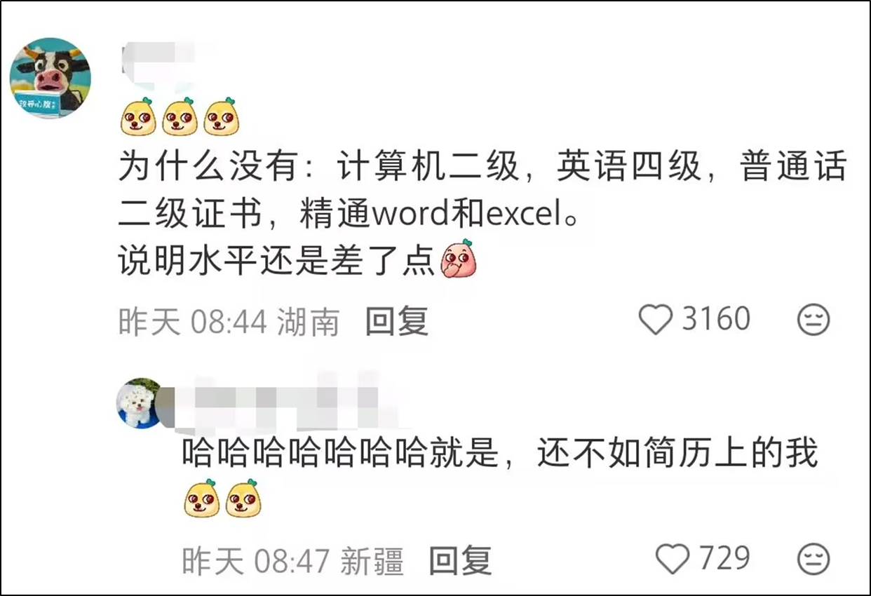此外,在这些简历里面,没有一个人会把计算机二级、英语四六级、普通话水平证书写到里面,因为这些奖项根本就不值得一提。