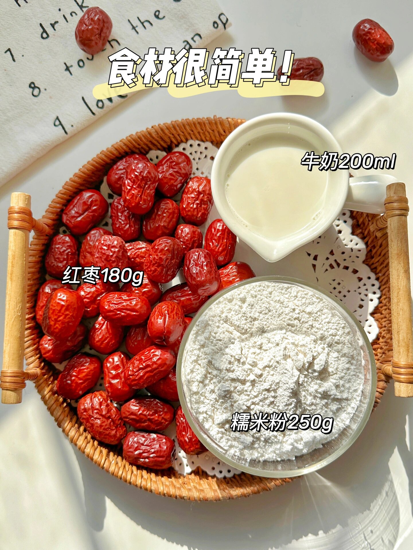 食材:红枣180g、糯米粉250g、牛奶250ml