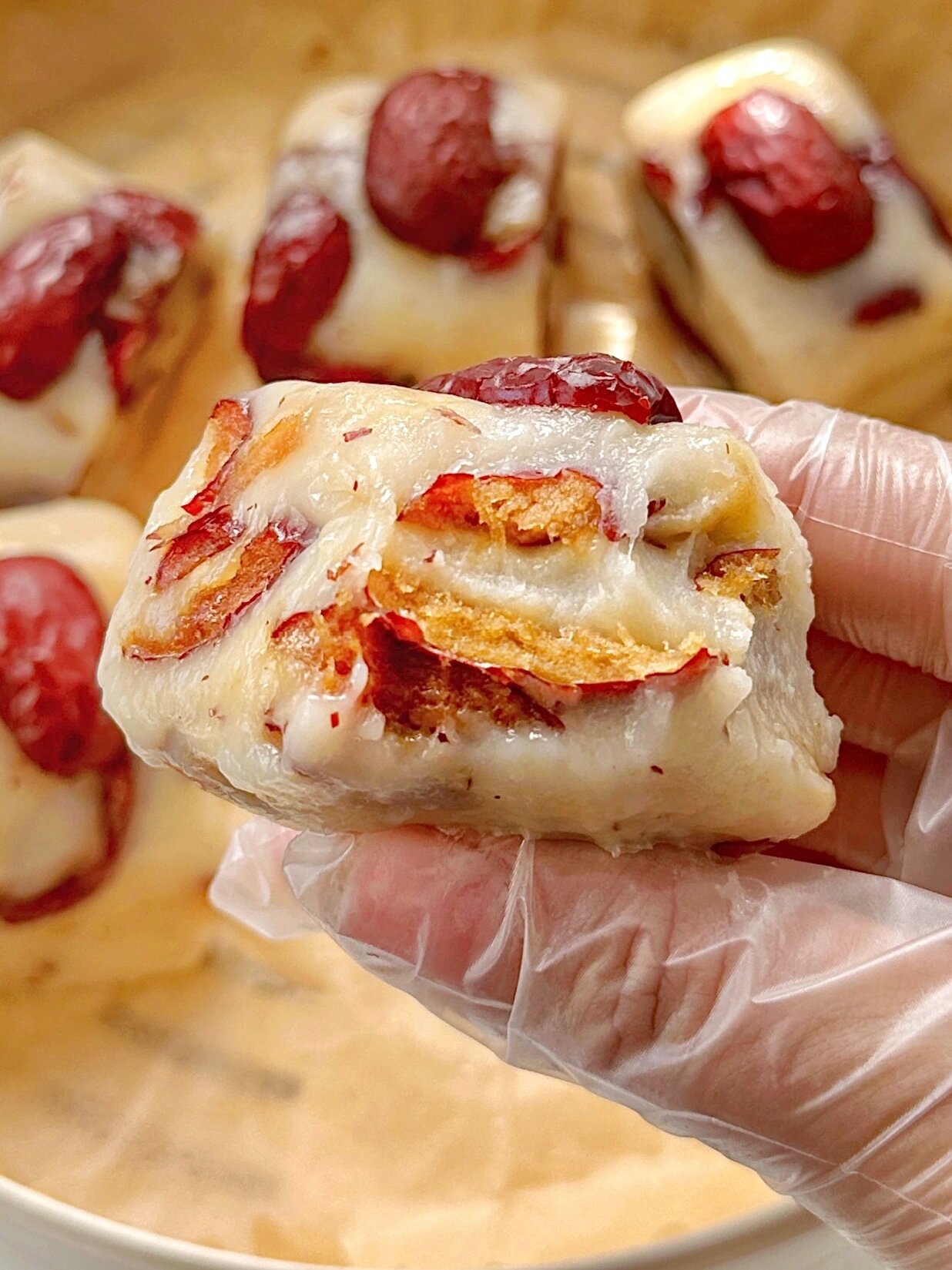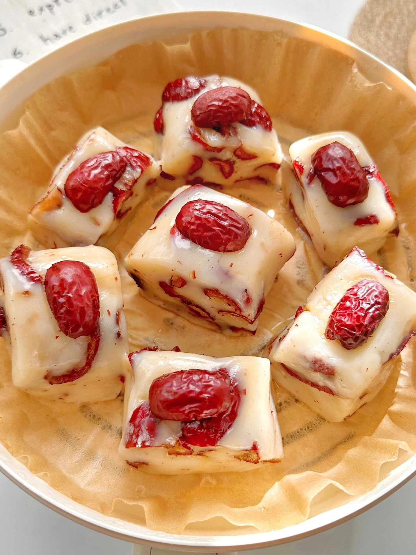 做法:1.红枣剪碎,加入糯米粉,倒入牛奶搅拌成絮状,揉成不粘手面团,整理成长方体