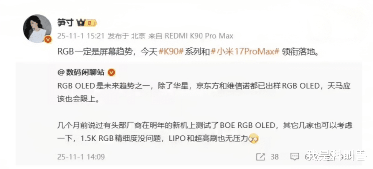 除了红米K90系列,此次消灭的17promax也已经用上了这种新的显示技术,所以小米家这次的旗舰手机小米17promax也是1.5K屏幕,不得不说,2000段位和5000段位用一样技术,也是没谁了。