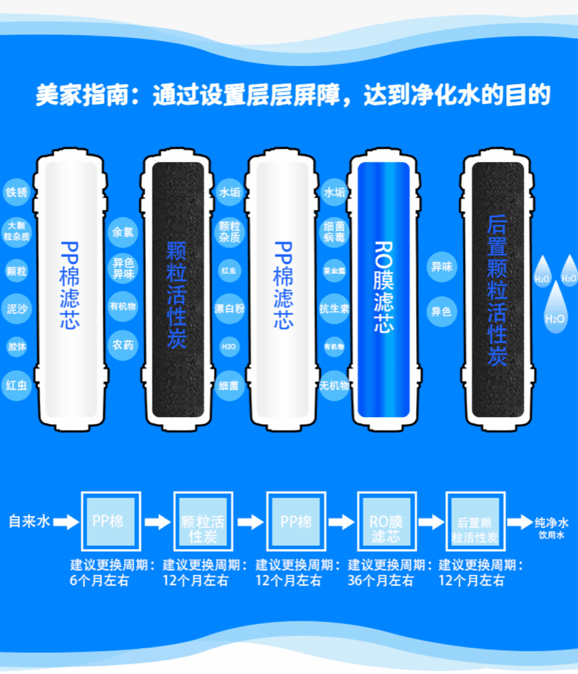 滤芯主要由PP棉、活性炭、超滤膜和RO反渗透膜构成。