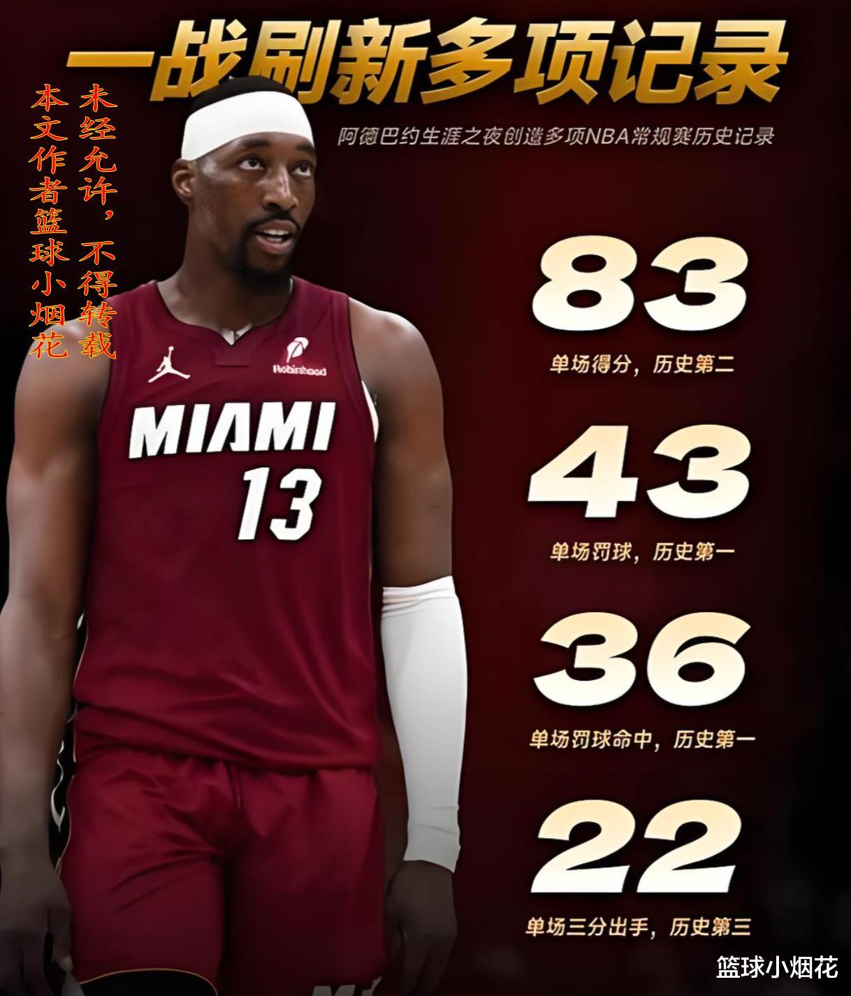 我问你,阿德巴约是历史级别的得分手吗?很明显他不是,他的进攻能力在NBA都排不上前二十,但他靠刷分,拿到了83分,那是不是意味着,任何一名进攻能力比热巴强的球员,在不考虑球队打法战术、队友心态以及比赛输赢的前提下,就可以疯狂出手,只为打破记录?这样的记录,即便是拿到了100分,你认可吗?
