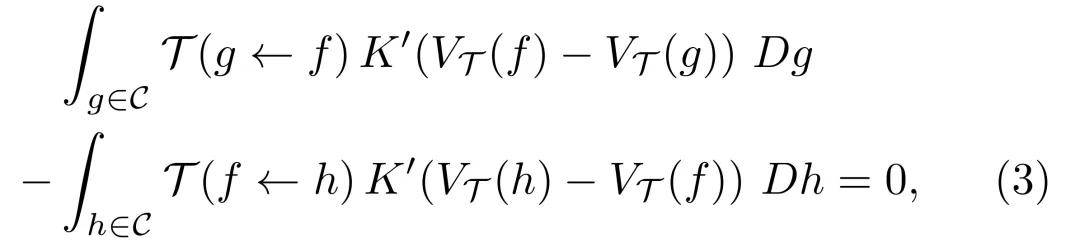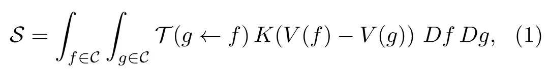 给定一个全局势函数 V,研究者将智能体的给定转移 (g←f) 对势函数的违背定义为 K (V (f)−V (g)),其中 K (x) 是一个凸函数,用于描述从状态 f 到状态 g 的转移在多大程度上违背了势函数 V 的排序。为了量化智能体行为与势函数之间的整体不匹配度,研究者以转移核 (g←f) 为权重,将作用量 定义为全局平均违背: