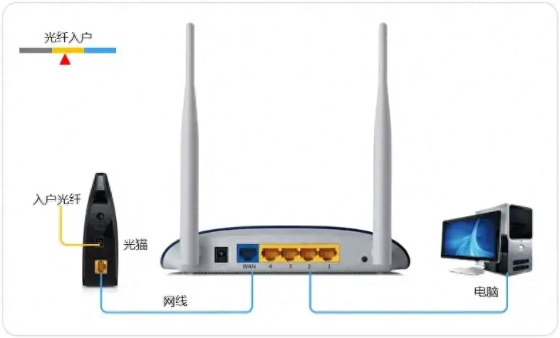 一.首先进行线路连接。如下图:"光猫LAN口"—网线—"路由器WAN口"。